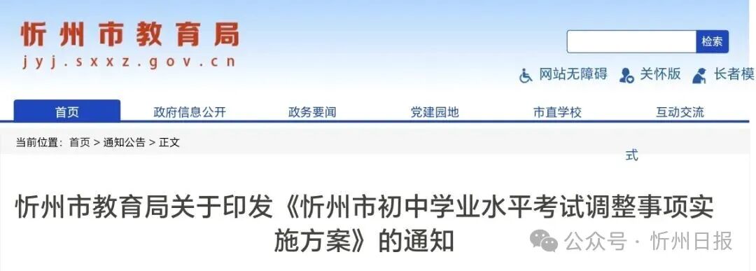 根据《山西省教育厅关于调整初中学业水平考试部分事项的通知》(晋教〔2025〕7号)精神,结合我市实际,制定《忻州市初中学业水平考试调整事项实施方案》,现印发给你们,请认真贯彻执行。