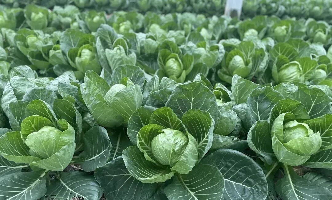 近日,记者走进光子农业专业合作社,温室大棚内的景象瞬间令人眼前一亮,一畦畦茴子白长势正盛,宛如一颗颗饱满的绿宝石镶嵌在沃土之上。它们紧紧簇拥成半球状,外层叶片舒展蓬松,边缘泛着淡淡的白晕,内层叶片愈发鲜嫩翠绿,撕开时能看到清晰的纤维纹理,满眼生机盎然。