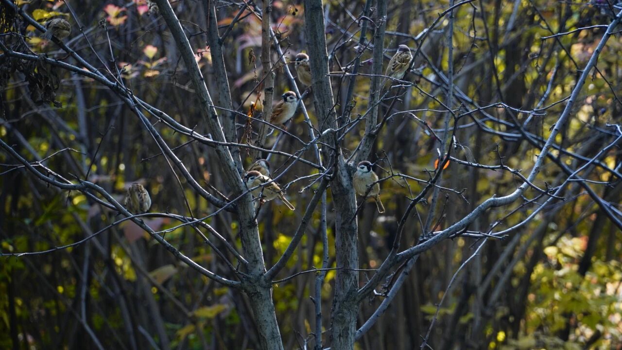 偶尔有麻雀落在树枝上